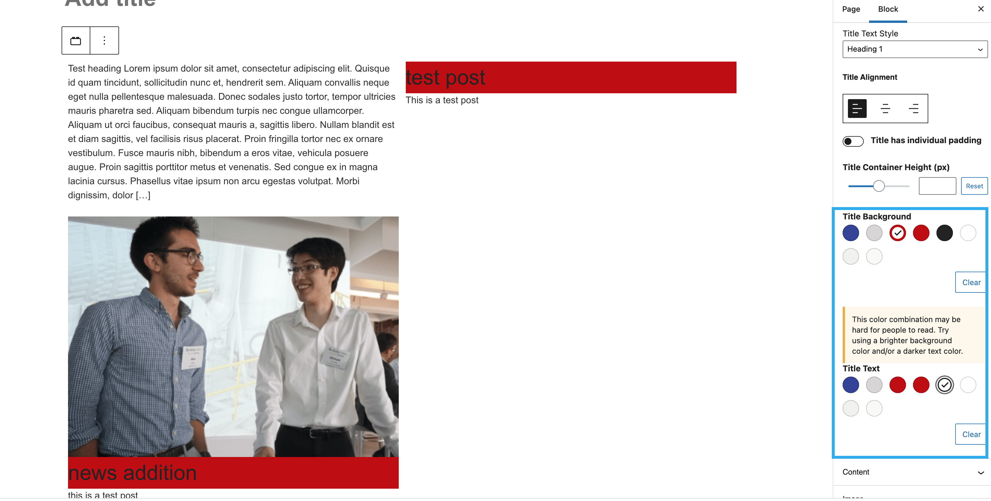 The Dynamic card block also includes a feature which triggers an alert should the background and text colour combination not meet the minimum colour contrast.