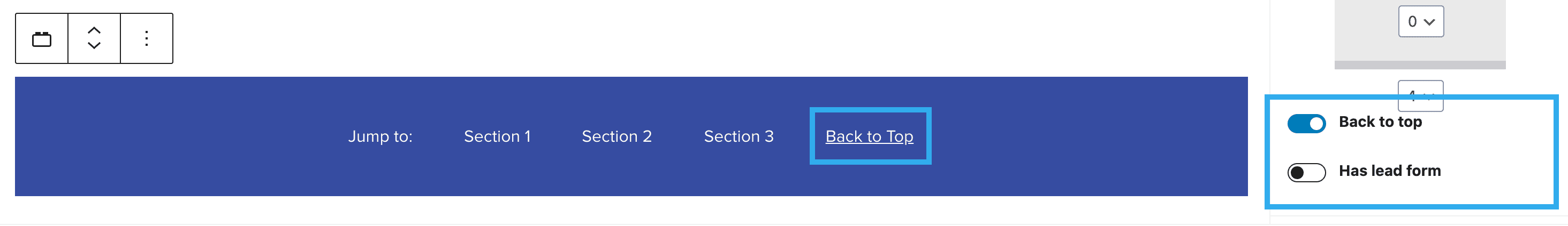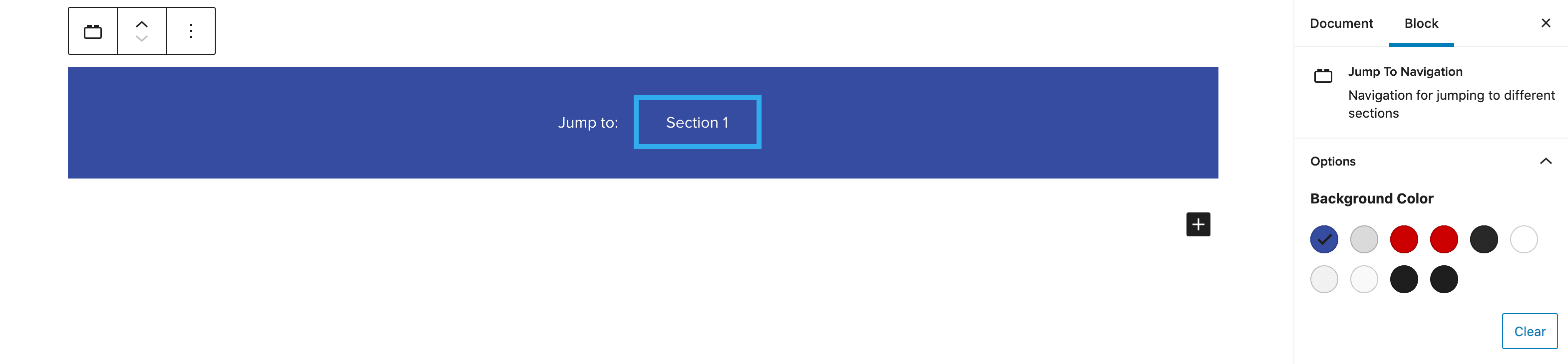 The Jump to Navigation block allows users to easily navigate around a page by jumping to a specific section from anywhere on the page. The Section block must be used with the Jump to Nav block as it will jump to sections only and not individual blocks.