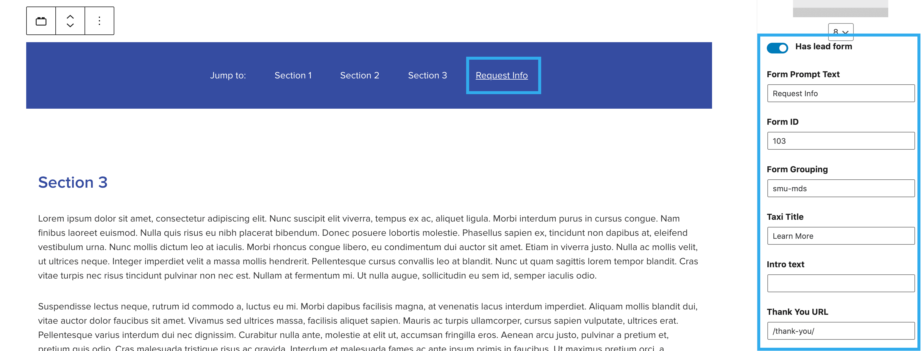 A lead form can be added to the Jump to Nav by turning on ‘Has lead form’ in the options panel. The Form Prompt Text will default to ‘Request Info’, however this can be changed to anything you wish. Further information on Lead Forms can be found here.