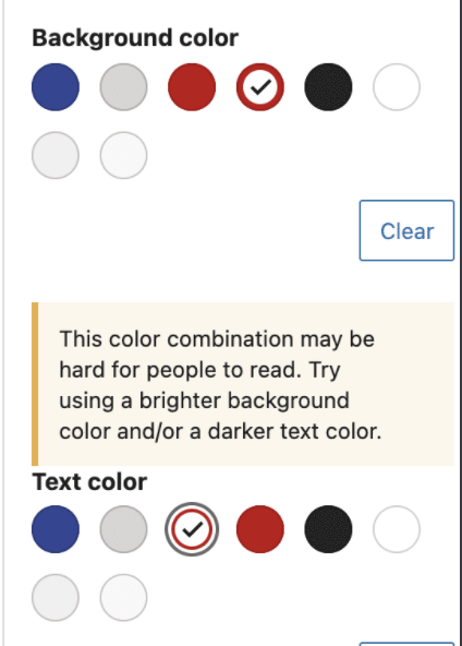 The Jump to Navigation block also includes a feature which triggers an alert should the background and text colour combination not meet the minimum colour contrast.