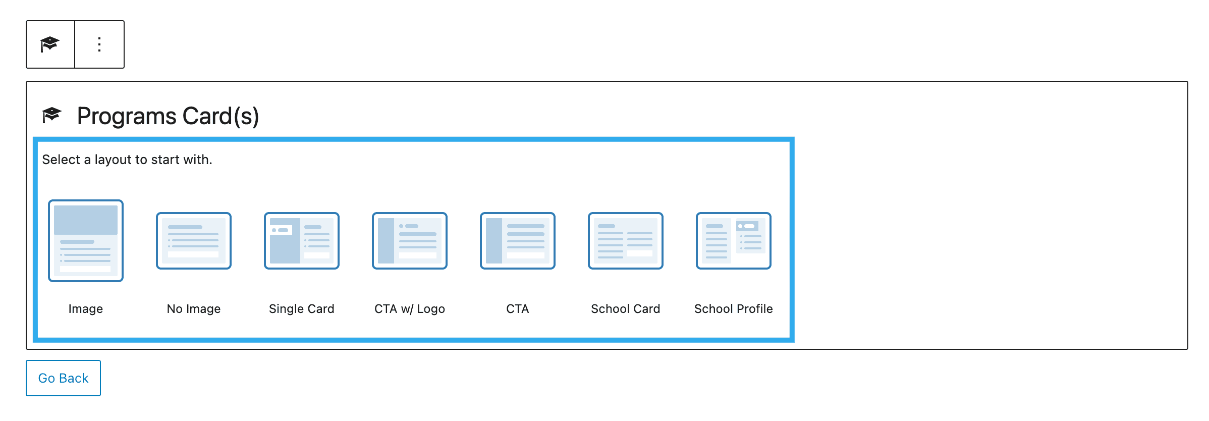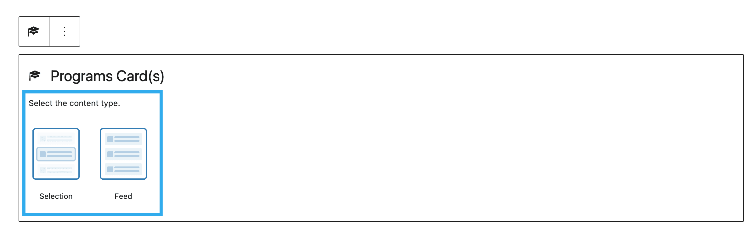 When you first insert the Programs Card(s) block, you will be asked to select the ‘content type‘ – you can choose between ‘Selection‘ and ‘Feed‘.