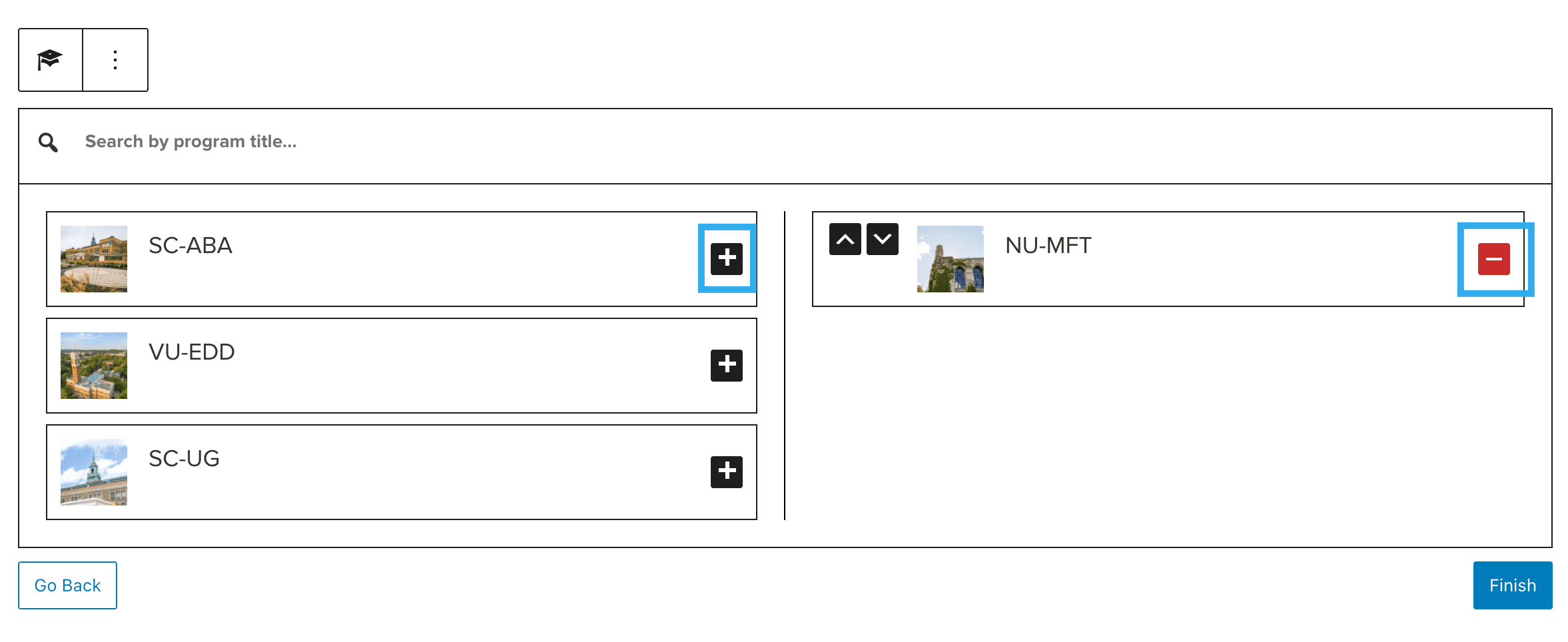 There are two main Programs blocks in the 2U theme, which have many variations and customisability. The two blocks are named ‘Program Card(s)‘ and ‘Programs Table‘.