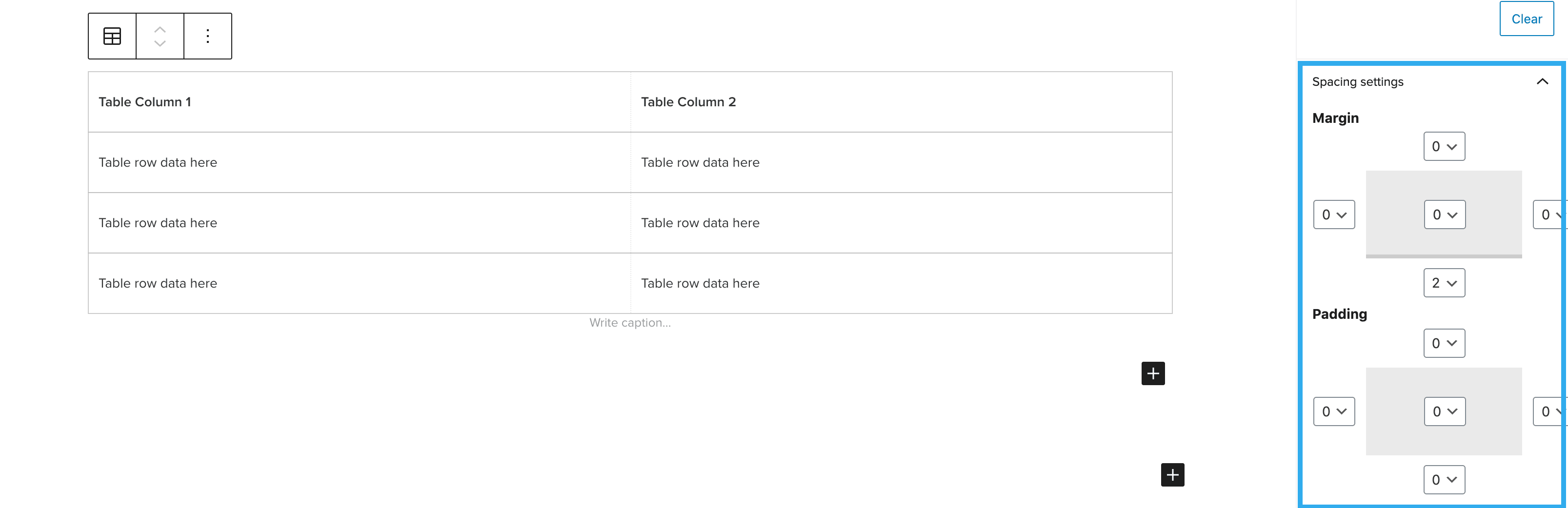 The spacing settings allow you to alter the margin and padding around the table heading and the table. Each side of margin and padding can edited independently from one another and can be previewed in the settings panel: