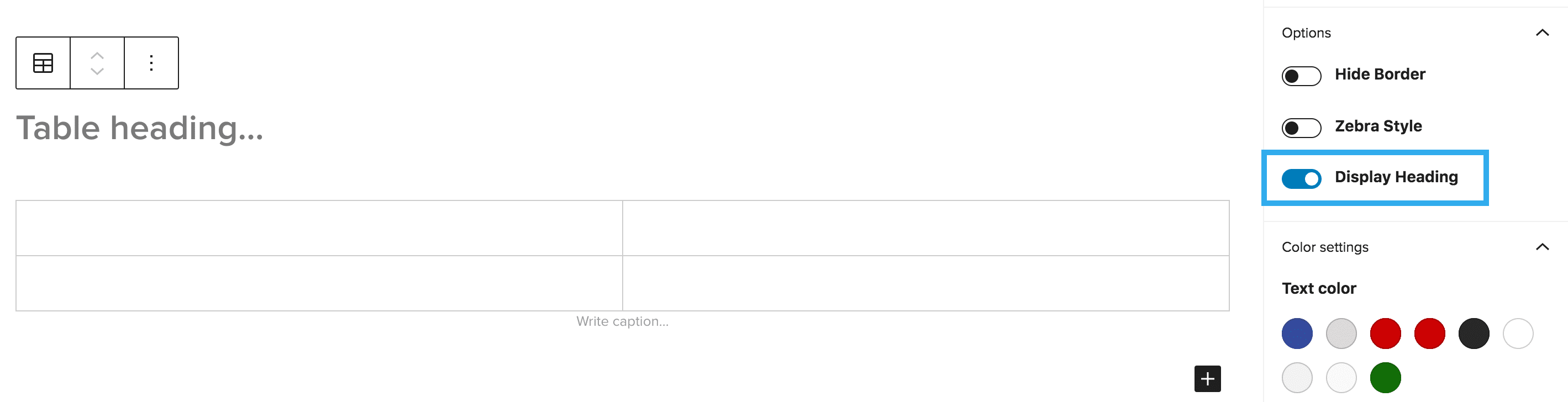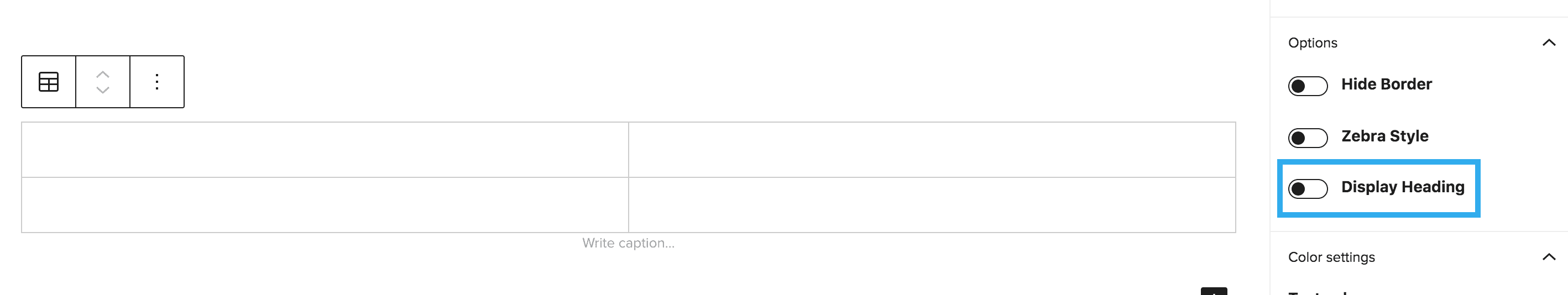 When initially inserting a table block you will be given the option to insert a table heading. If you do not want to use a heading on your table, a new toggle has now been added to the sidebar settings for the table. You can simply toggle this off/on to display or hide the heading.