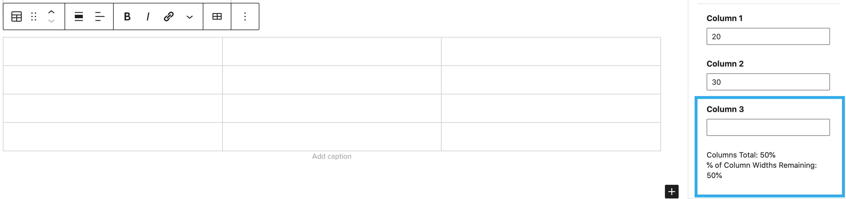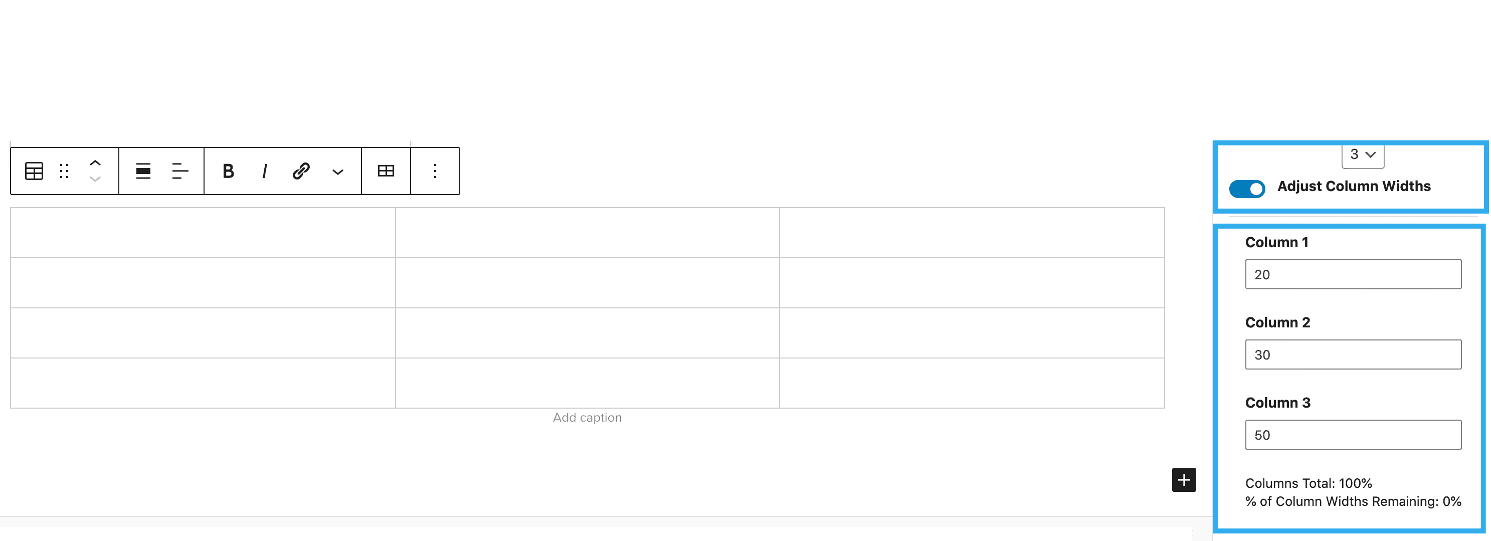 The table block also has the ability to set desktop column widths as a percentage for each column. To use, toggle across the ‘Adjust Column Widths’ slider within the options panel. Once this is selected you can begin inputting your desired width percentages. In the example below you can see 20%, 30% and 50% have been used – all columns must equal 100%.