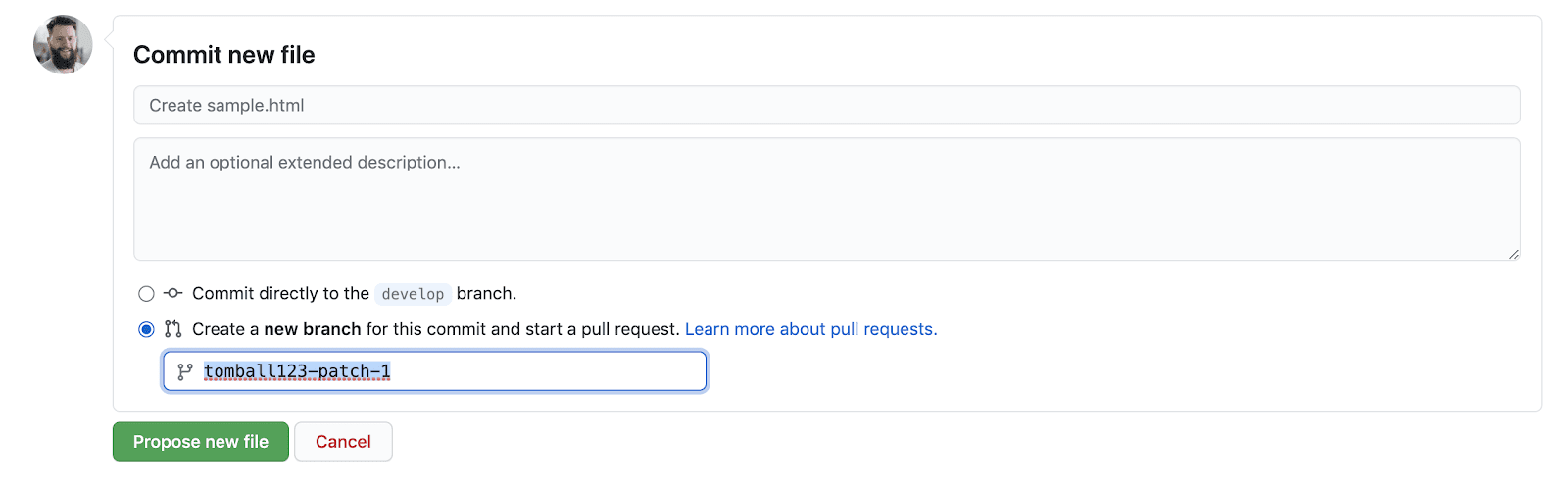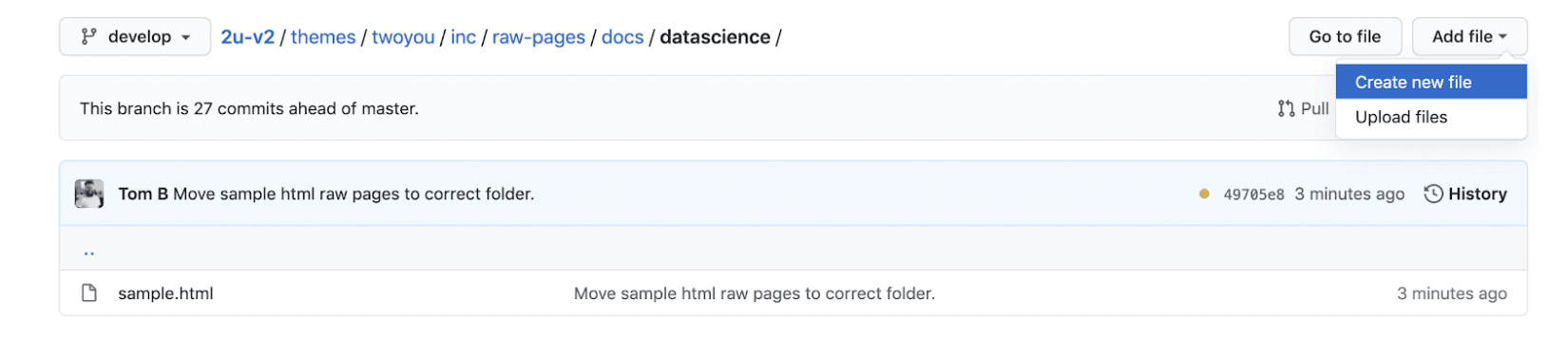 - When ready to commit your raw file, scroll down, and select the second option, you are able to commit to develop (staging) directly, but not master (production), so you will create a pull request for someone to review when doing this on production