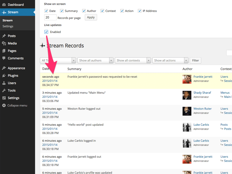 Stream allows you to view WordPress activity. It tracks actions from every user that is logged in into an organised activity stream which can be filtered by user, role, context, action or IP address.