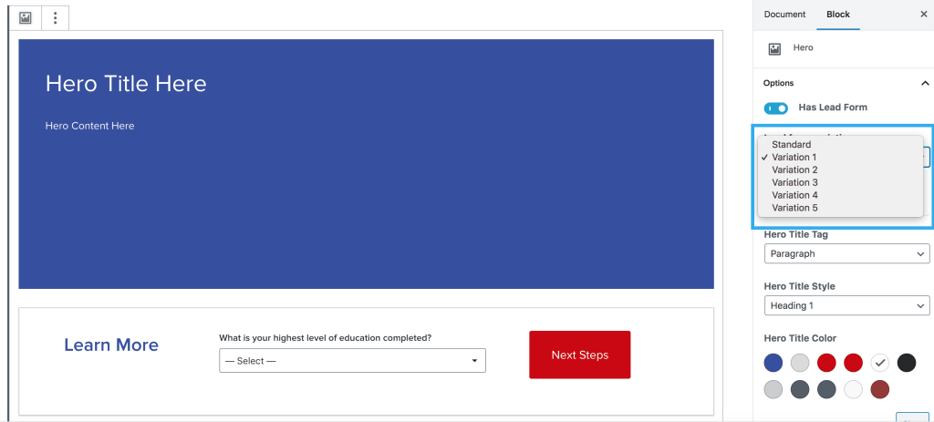 The Hero Lead Form variations have been pulled across from Harmony and integrated within the Hero block, so you can now easily select which variation you would like to use.