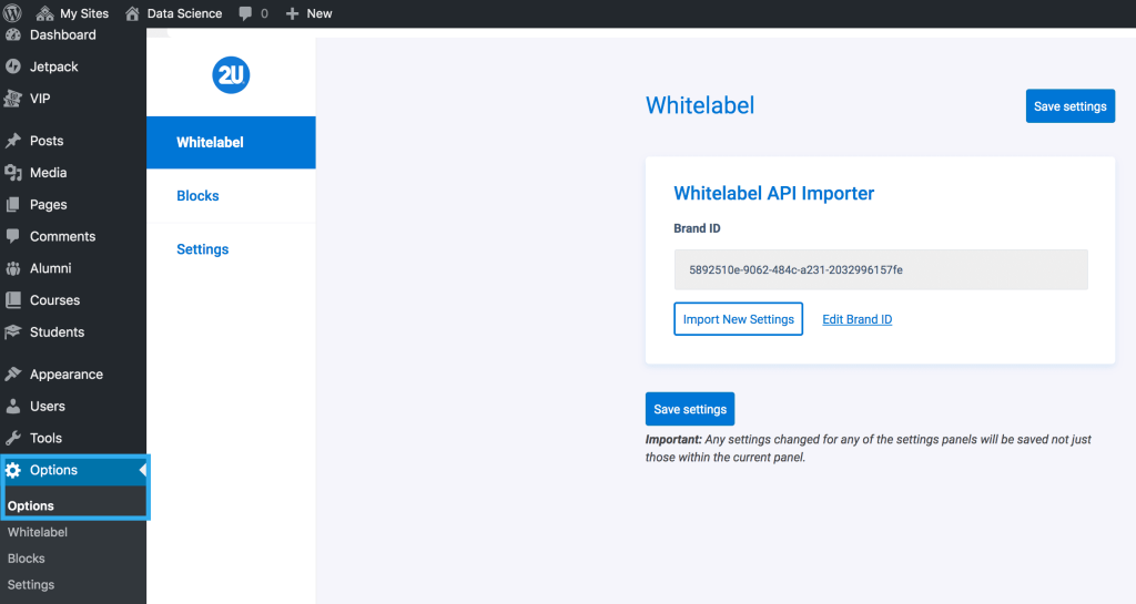 The integration between Whitelabel and WordPress, was custom built fully to meet the needs of the 2U team. Big Bite received an API endpoint from 2U and built out an API interaction for Whitelabel, this included setting up the build scripts for the options page within Global Settings.