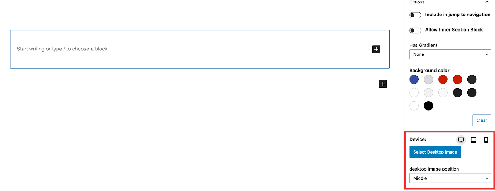 Similarly to the New Image Block there is a device selector that will allow you to select a different image for each device. If only the desktop image is set then that image will be used across all the devices.