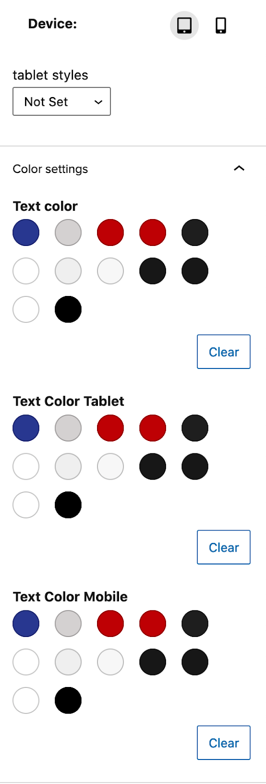 - There is a device selector for tablet and mobile that allows you to change the styles of the heading or paragraph when viewed on a tablet or mobile device.