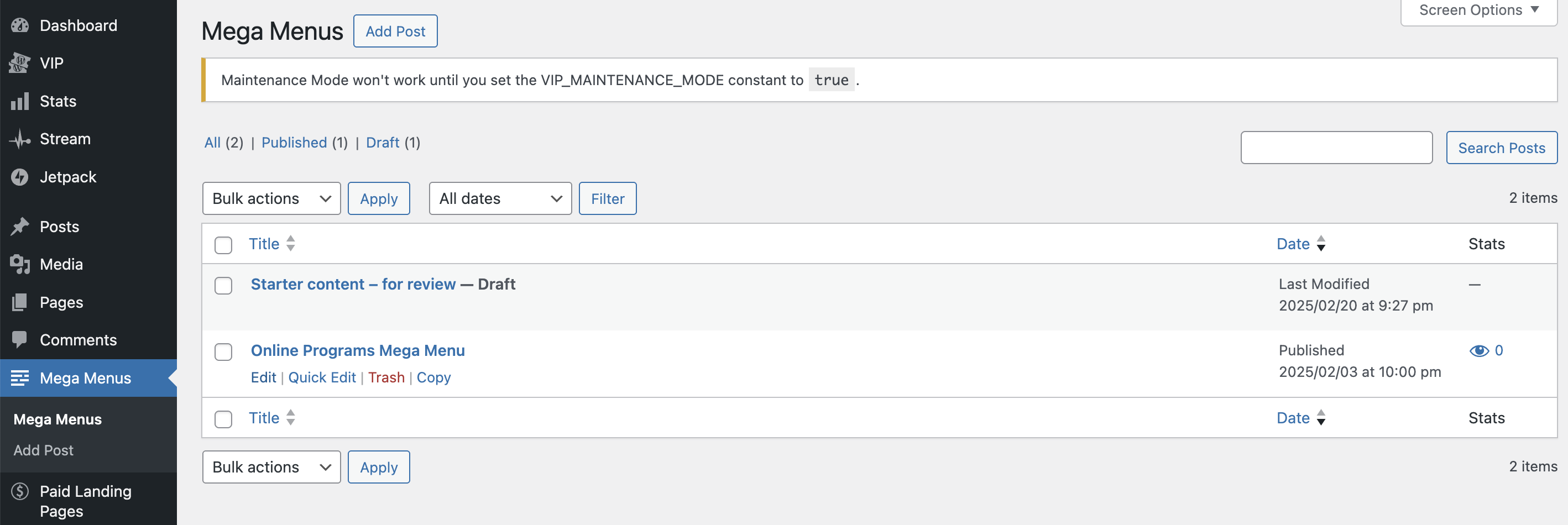 - Select the title of the Mega Menu you wish to edit (e.g., “Online Programs Mega Menu”).