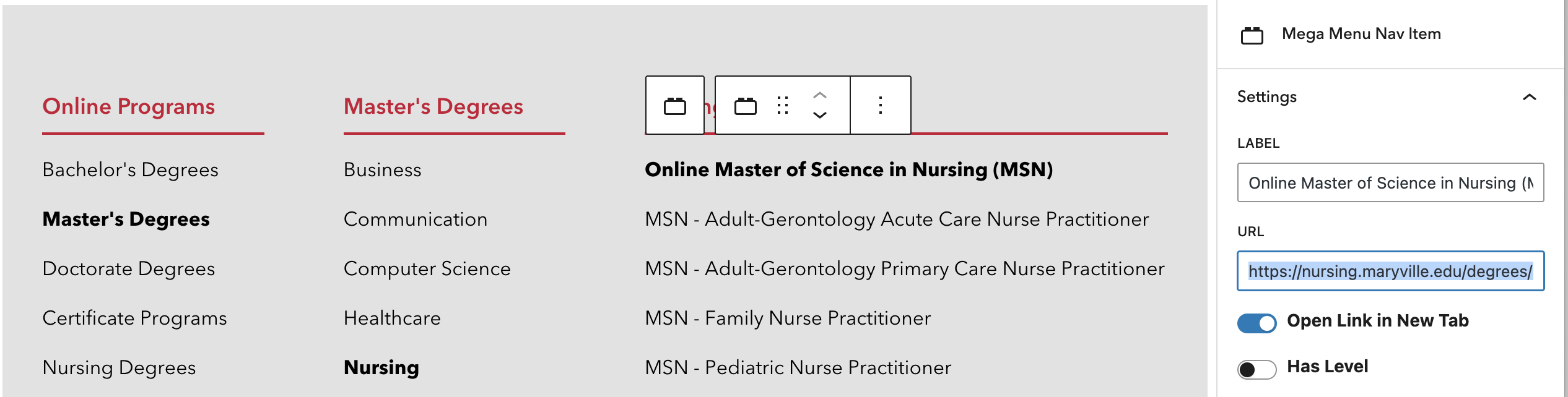 https://nursing.maryville.edu/degrees/example/). - They should also have the Open Link in New Tab toggle enabled.