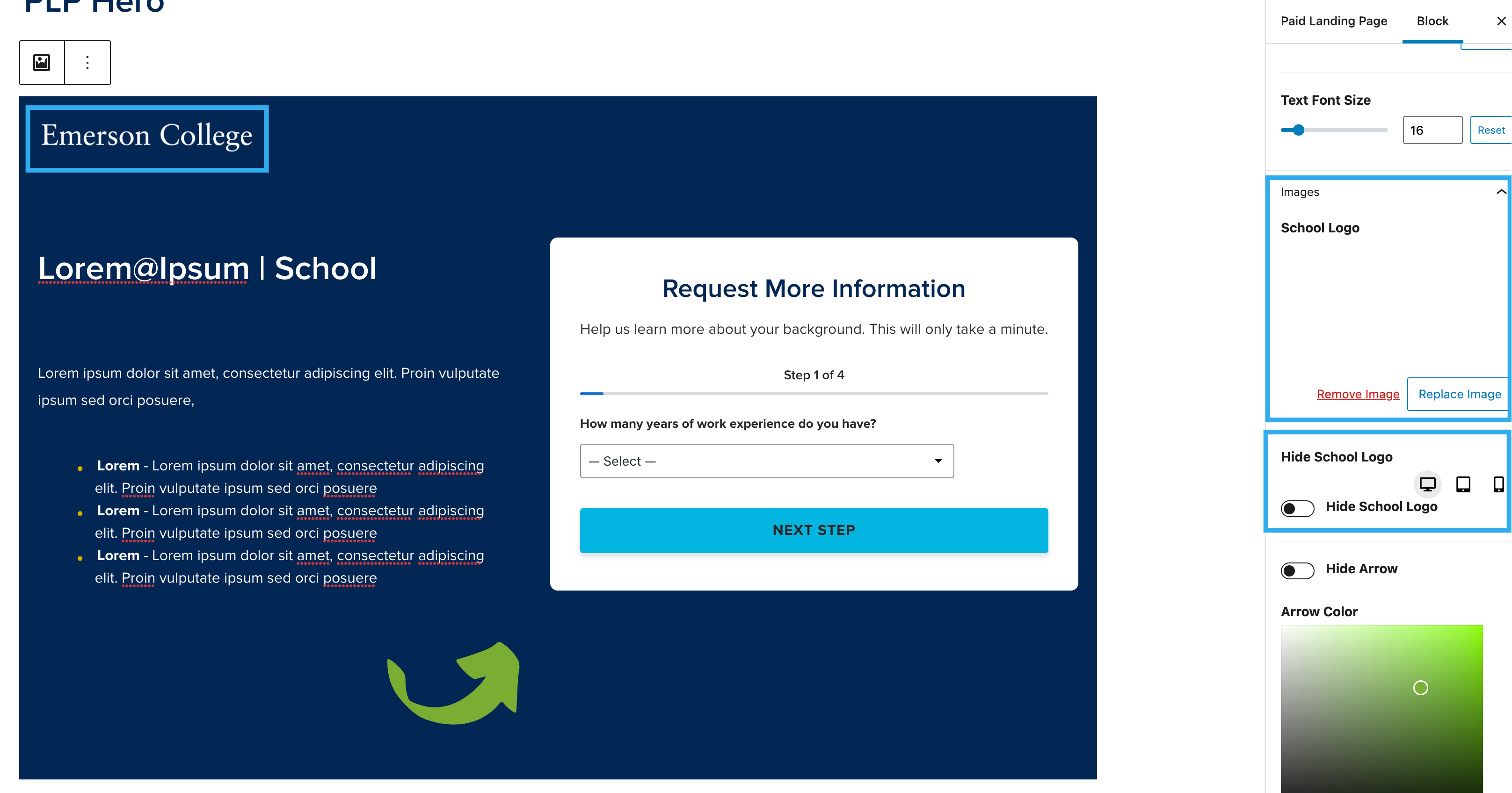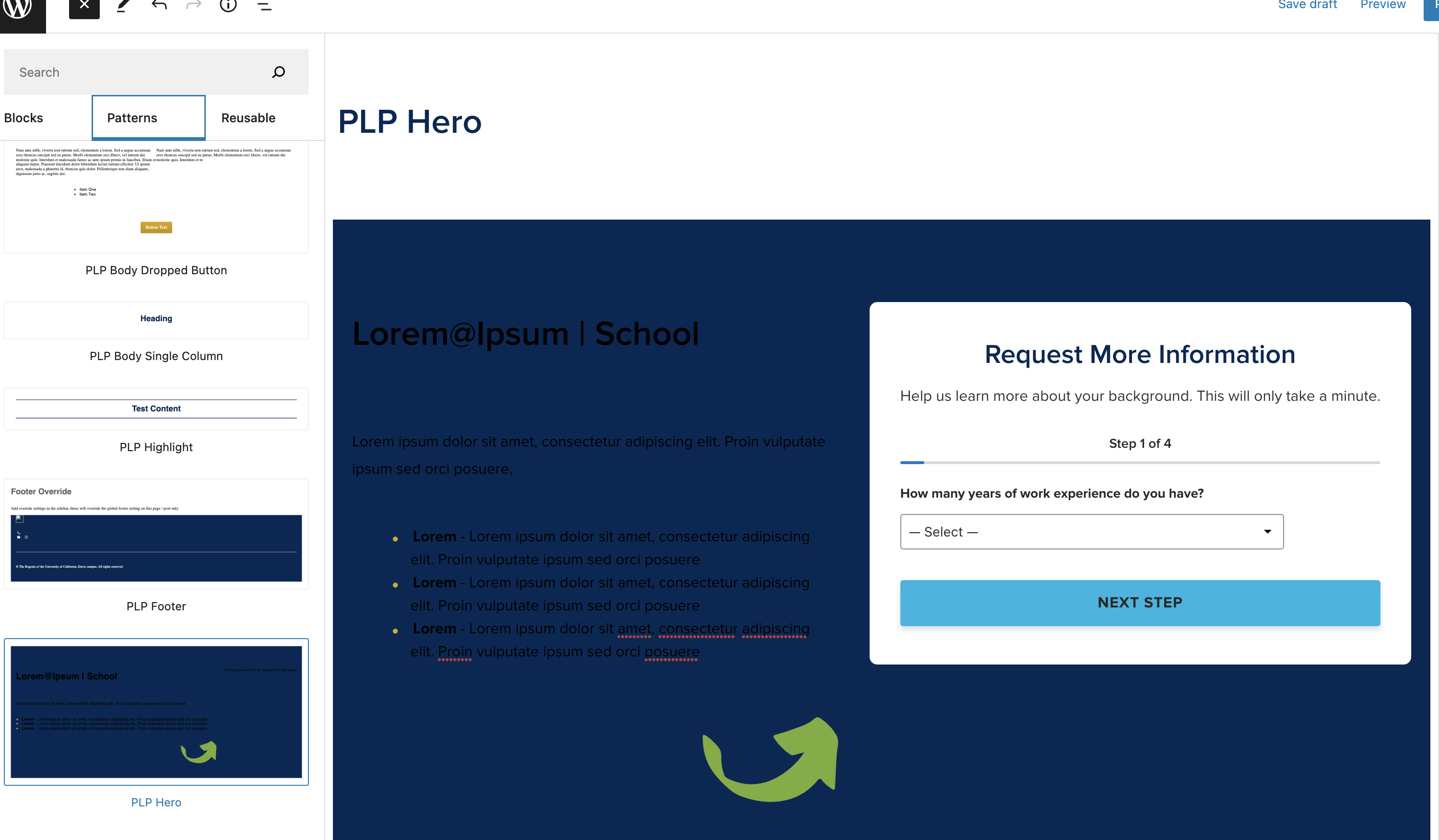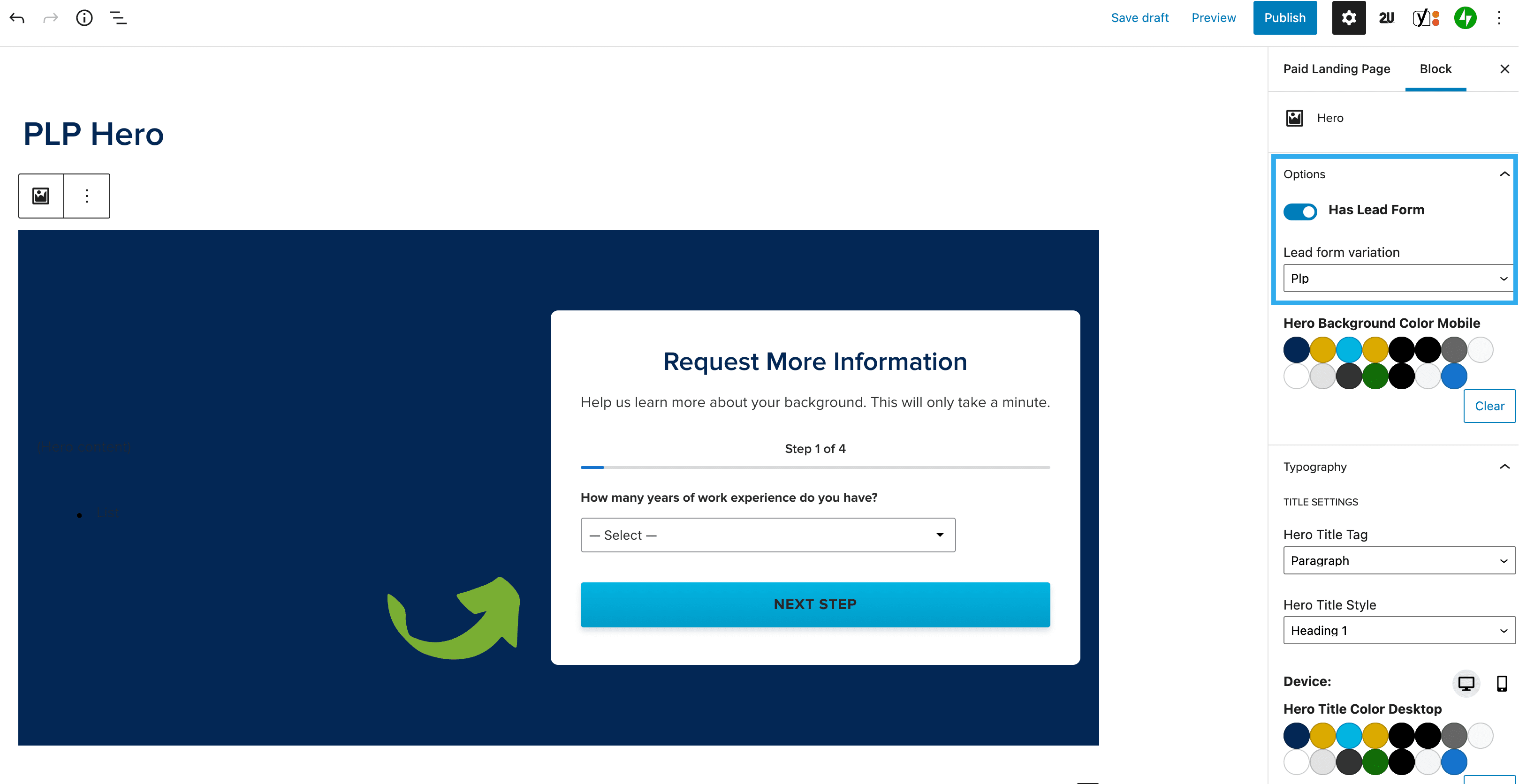 The PLP Hero can either be inserted manually, or you can insert the PLP Hero block pattern from the preset block patterns list. To insert manually, simply insert a regular Hero block into a PLP page, toggle the ‘Has Lead Form‘ setting on and select the PLP lead form variation: