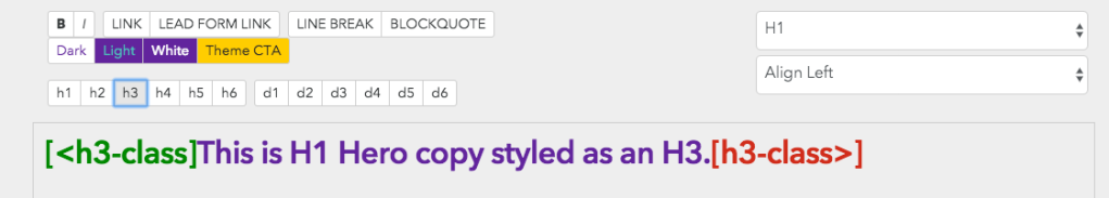- Header Buttons (h1-h6) / Display Buttons (d1-d6): These buttons are used to override the style that is selected for accessibility. For example, if the H1 style is too large for the hero text, you can override the style using the header or display buttons. See example below.