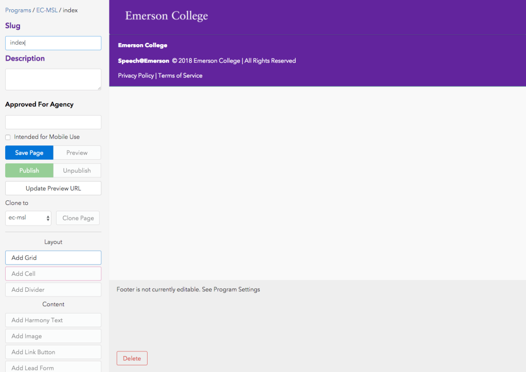 In the top right corner you will also see three buttons: New Page, Sitemap and Settings. Selecting New Page will bring you into a blank canvas to build a new page. Selecting Sitemap will open a new window with the Sitemap, which includes information about each page. Selecting Settings will bring you to an area to fill out fields about that specific program.