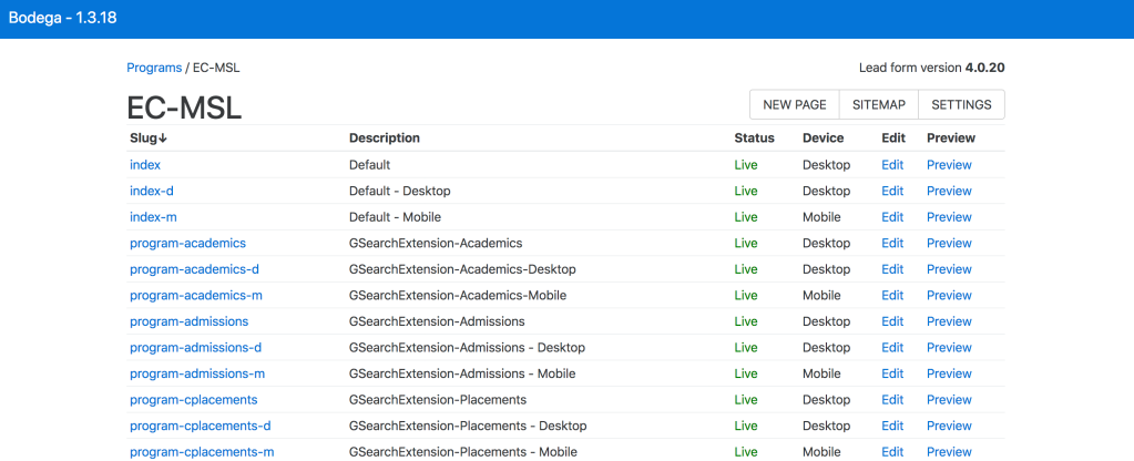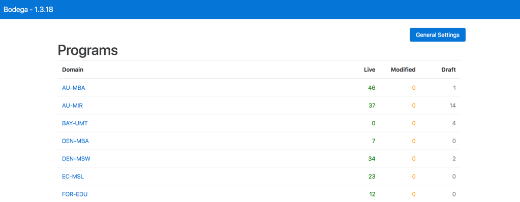 Once you have logged into Bodega, you will see a list of all Programs and how many live, modified and draft pages there are for each program. Live means the page is published and what you see on the canvas is the same that is on the live page. Modified means that the page is live but there are changes on the page within the canvas that are not published on the live page. Draft means you have built out a page within Bodega but the page is has not been published.