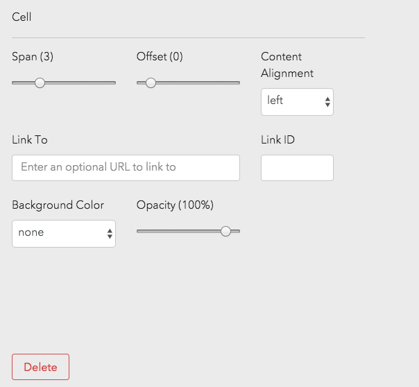 Use the cell layout option to organize your content. Cells sit within Grids. You can have multiple cells within a grid that span different widths all adding up to 12. When adding a cell, there are a few settings you have to chose from.