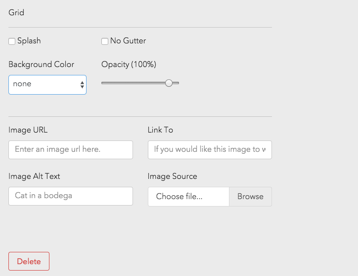 - Splash: Checking this off will bring all contents in the grid edge to edge, meaning there is no padding on the edge of the page. The most common use for this is when adding in your hero image. Most often, hero images are set to splash