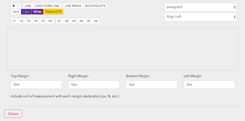 - Link & Lead Form Link Button: These allow you to add links to your copy. The Lead Form Link button makes it easly to link copy back to the Lead Form on the page.