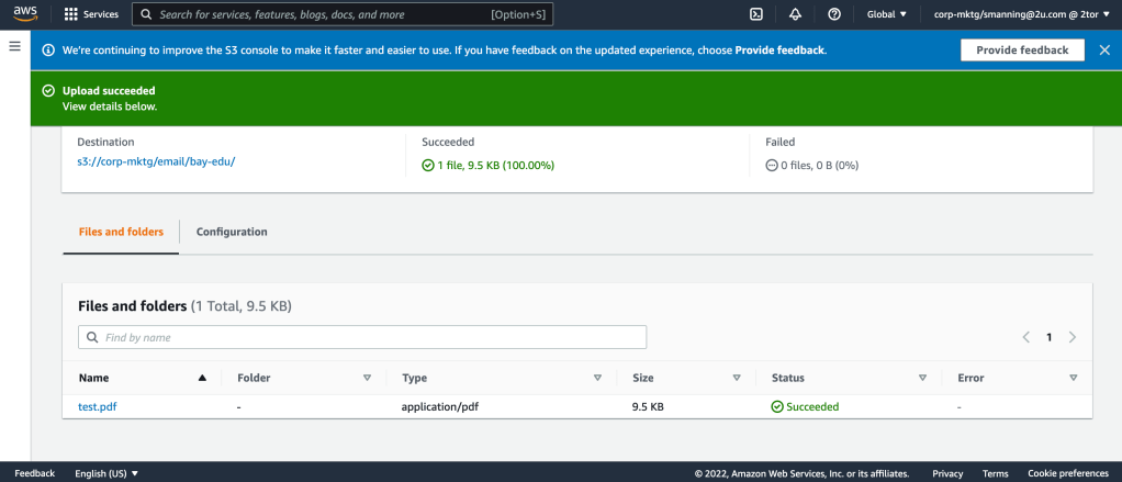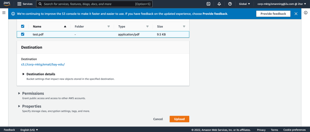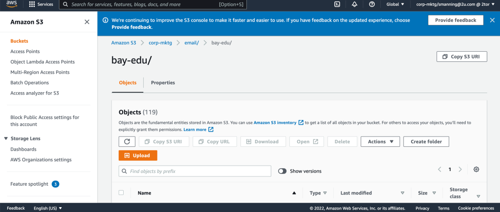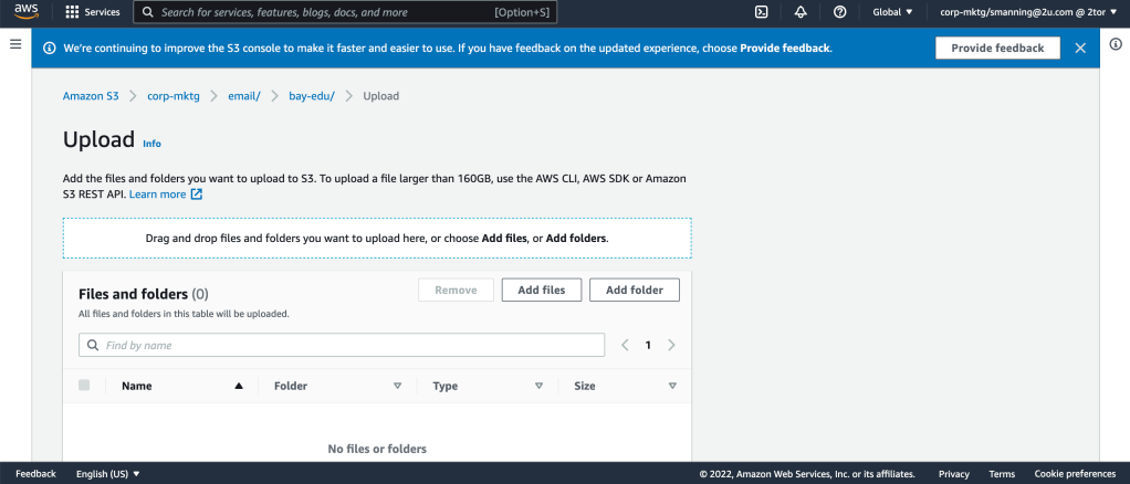 From here, you can navigate to the correct buckets. Follow corp-mktg > email and then type in your program name. Once here, you can go ahead and click upload.