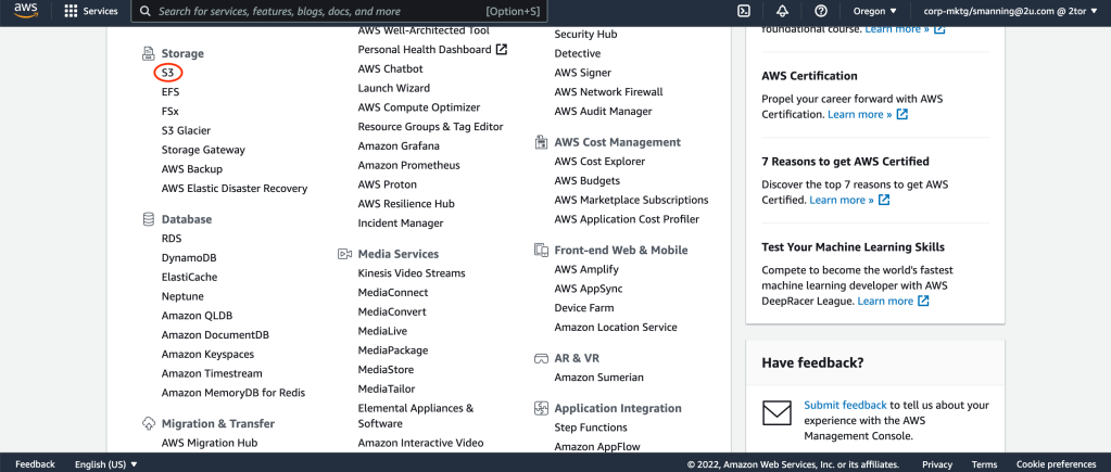 After clicking on this icon, you will be taken to a page titled “AWS Management Console.” You will then want to click on the “All Services” dropdown, then scroll down to the “Storage” heading where you will find “S3.”